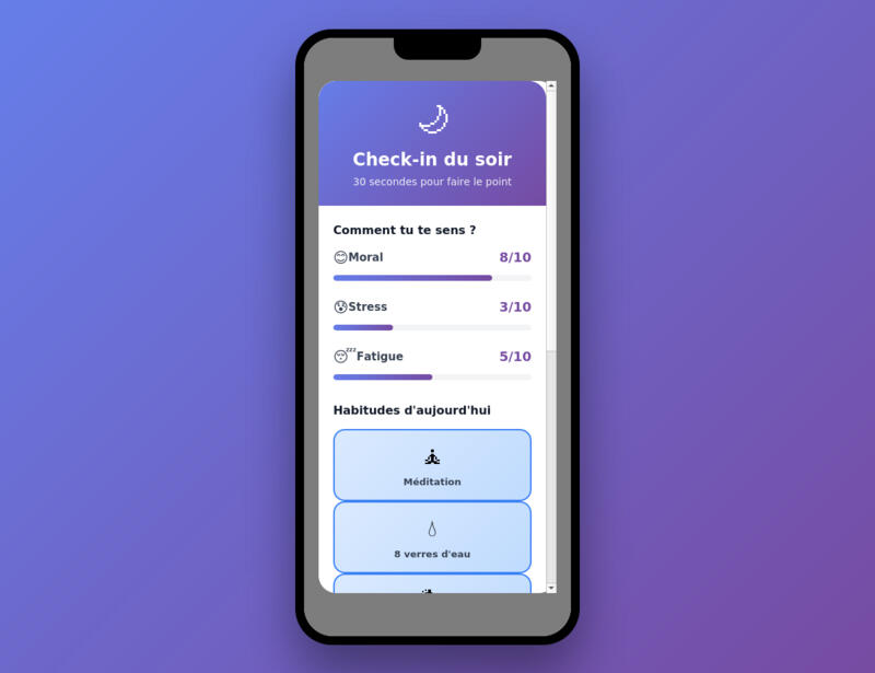 Chaque soir, trois sliders pour ton moral, stress et fatigue.